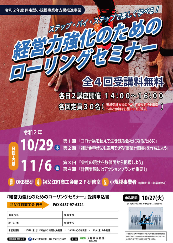 祖父江町商工会では、令和2年度の小規模事業者の皆様の支援の一環として、持続化補助金などの申請にむけた事業計画策定をサポートする全4回のセミナーを次の日程で開催いたします。